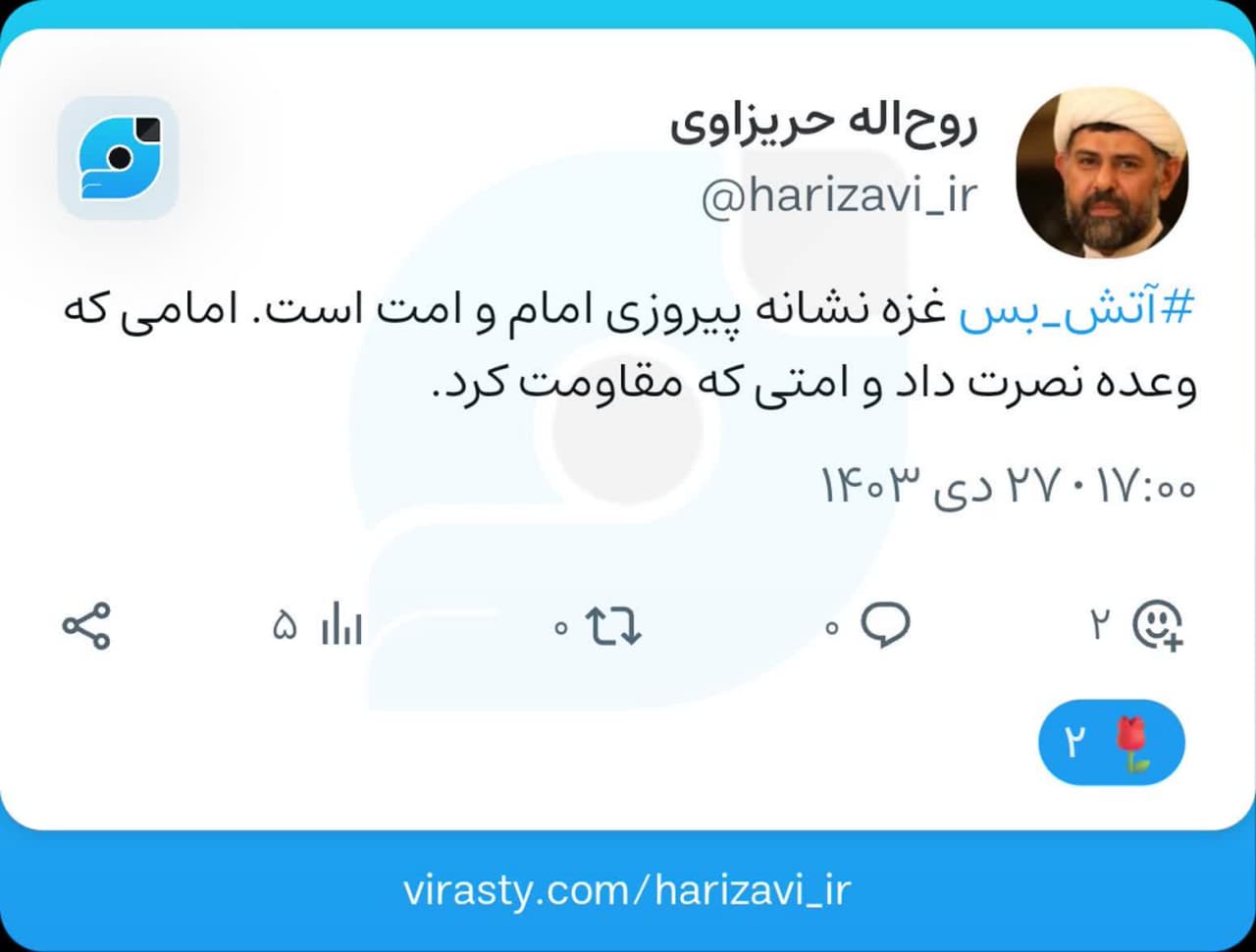 حجتالاسلام روحالله حریزاوی به مناسبت آتشبس در غزه در صفحه شخصی خود در شبکه ویراستی پستی را منتشر کرد.