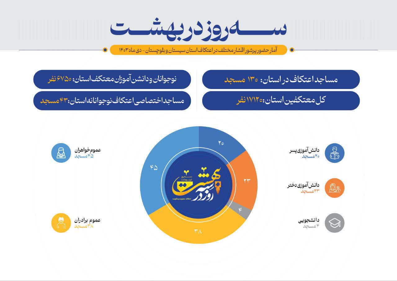 به گزارش روابط عمومی سازمان تبلیغات اسلامی، مدیر کل تبلیغات اسلامی سیستانوبلوچستان از افزایش چشمگیر شرکتکنندگان در مراسم معنوی اعتکاف خبر داد. حجتالاسلام جهانشاهی اظهار داشت : امسال در مجموع 130 مسجد در سطح استان پذیرای 17120 معتکف بود.