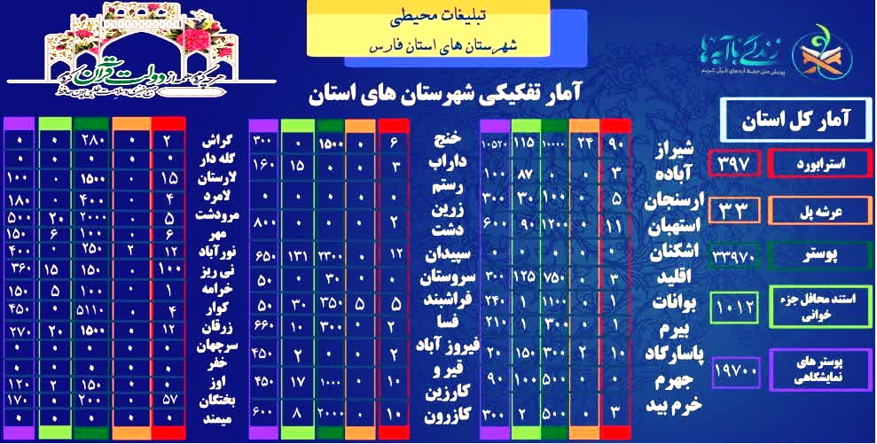 با آغاز طرح ملي زندگي با آيهها در سراسر كشور، تبليغات محيطی اين پويش ملی با بيش از ۵۵ هزار پوستر، استرابورد، استند و ... در استان فارس انجام شد.