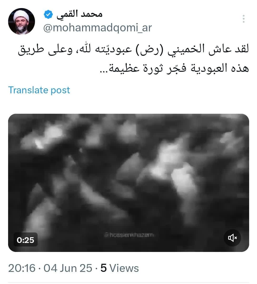 به گزارش روابط عمومی سازمان تبلیغات اسلامی، همزمان با سالروز رحلت بنیانگذار کبیر انقلاب اسلامی، حجتالاسلام محمد قمی در صفحه شخصی خود در شبکه ایکس (ویژه مخاطبان عربزبان) ویدئویی از لحظه اعلام خبر رحلت حضرت امام خمینی(ره) توسط سید مقاومت، شهید نصرالله منتشر کرد و در ذیل این ویدئو نوشت: