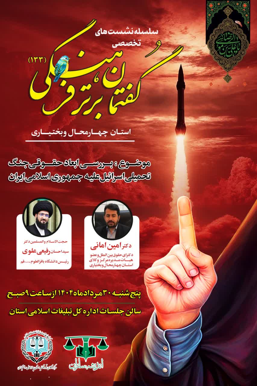 ۱۳۳مین نشست از سلسله نشستهای تخصصی گفتمان برتر فرهنگی استان چهارمحال و بختیاری با موضوع «بررسی ابعاد حقوقی جنگ تحمیلی اسرائیل علیه جمهوری اسلامی ایران» برگزار میشود.