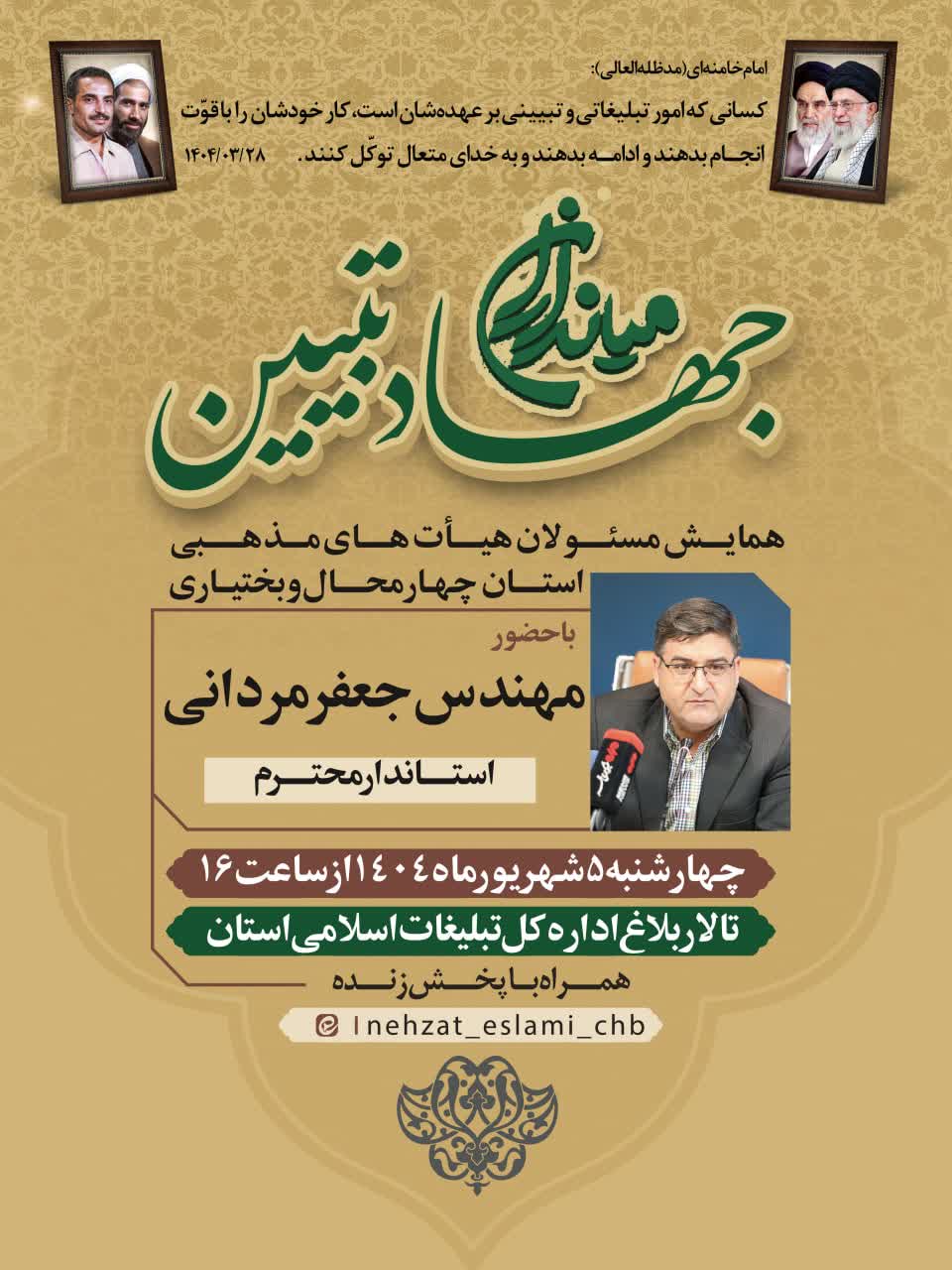 همایش «میدانداران جهاد تبیین» با حضور مسئولان هیئتهای مذهبی چهارمحال و بختیاری در شهرکرد برگزار میشود.