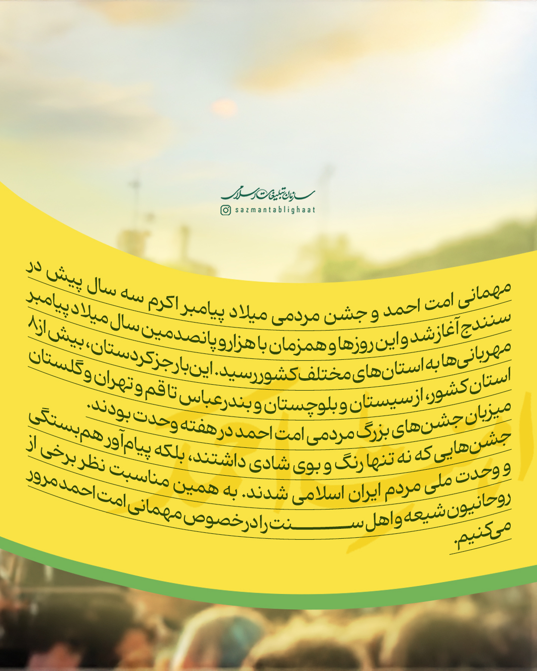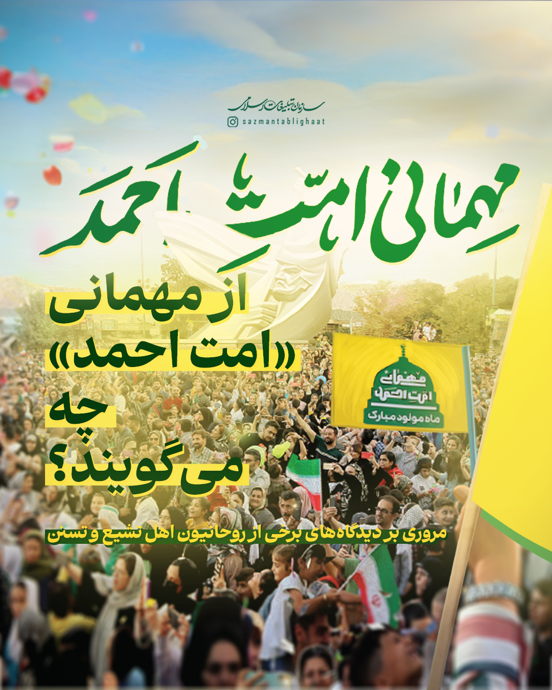 به گزارش روابط عمومی سازمان تبلیغات اسلامی، مهمانی امت احمد و جشن مردمی میلاد پیامبر اکرم سه سال پیش در سنندج آغاز شد و امسال، همزمان با هزار و پانصدمین سال میلاد پیامبر مهربانیها به استانهای مختلف کشور رسید. اینبار جز کردستان، بیش از 8 استان کشور، از سیستان و بلوچستان و بندرعباس تا قم و تهران و گلستان میزبان جشنهای بزرگ مردمی امت احمد در هفته وحدت بودند. جشنهایی که نه تنها رنگ و بوی شادی داشتند، بلکه پیامآور همبستگی و وحدت ملی مردم ایران اسلامی شدند. به همین مناسبت نظر برخی از روحانیون شیعه و اهل سنت را در خصوص مهمانی امت احمد مرور میکنیم.