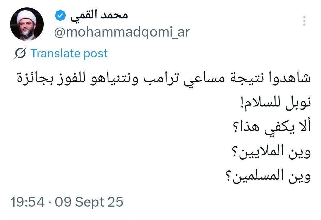 ۱۸ شهریور | حجتالاسلام قمی در واکنش به حمله اسرائیل به قطر نوشت؛