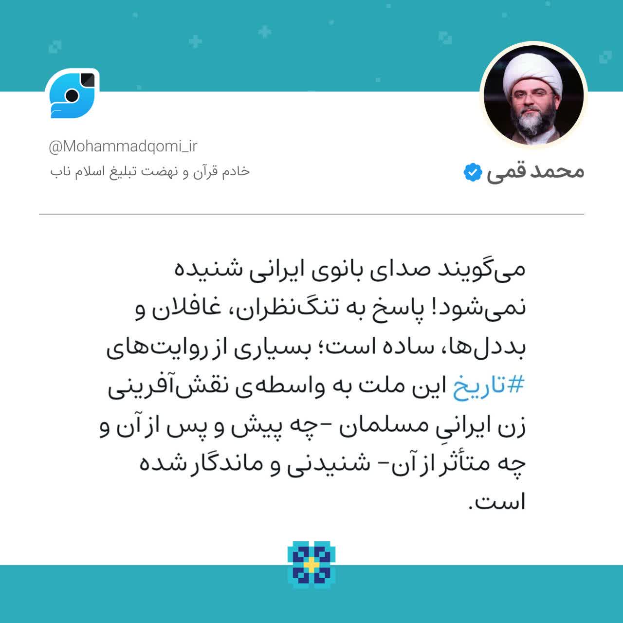 رئیس سازمان تبلیغات اسلامی در صفحه شخصی خود در شبکه اجتماعی ویراستی نوشت؛ میگویند صدای بانوی ایرانی شنیده نمیشود! پاسخ ساده است؛ بسیاری از روایتهای تاریخ این ملت به واسطهی نقشآفرینی زن ایرانیِ مسلمان شنیدنی و ماندگار شده است.