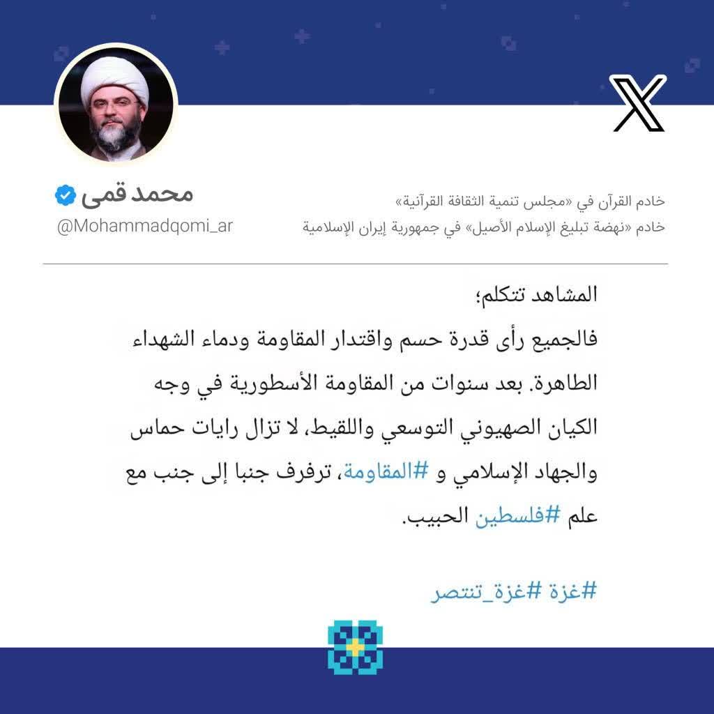 به گزارش روابط عمومی سازمان تبلیغات اسلامی، حجتالاسلام محمد قمی، رئیس سازمان تبلیغات اسلامی، با بازنشر تصاویری از شادی فلسطینیها در استقبال از اسرای تازه آزادشدهشان از زندانهای رژیم صهیونیستی و اقدام رسانهای هوشمندانهی رزمندگان مقاومت، لحظاتی پیش از تحویل اسرای صهیونیستی در صفحه شخصی خود در شبکه اجتماعی ایکس و به زبان عربی نوشت؛