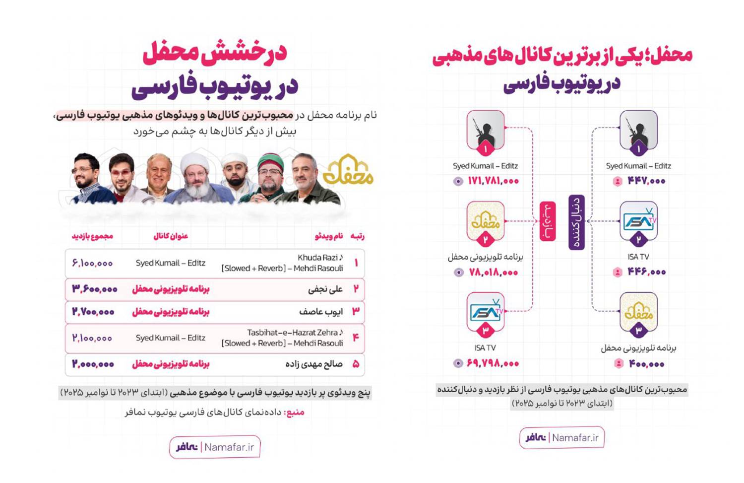 دادههای آماری نمافر، پایگاه آماری و تحلیلی از صنایع فرهنگ بنیان و خلاق در ایران و جهان نشان میدهد که در بازه سالهای ۲۰۲۳ تا اواخر ۲۰۲۵، کانال برنامه محفل در یوتیوب فارسی با جذب نزدیک به ۴۰۰ هزار دنبالکننده و ثبت رکورد بیش از ۵۴ میلیون بازدید، بر سکوی سوم ایستاده است. اما آنچه این آمار را فراتر از اعداد صرف میبرد، ضریب نفوذ و «وایرال» شدن محتوای آن است. حضور سه ویدئو از محفل (اجراهای علی نجفی، ایوب عاصف و صالح مهدیزاده) در میان پنج ویدئوی برتر این بازه، نشان میدهد که این برنامه توانسته با عبور از فرمهای کلیشهای، لحظاتی خلق کند که پتانسیل اشتراکگذاری بالایی دارند. در واقع محفل با تکیه بر جذابیتهای بصری و صوتی قرآن و نواهای آیینی، برندهای تمامعیار در جنگِ توجهِ پلتفرمهای مدرن بوده و مخاطبانی فراتر از دایره سنتی مذهبیها را نیز پای گیرندههای دیجیتال نشاند. اما ویدئوهای رکورد شکن برنامه محفل مربوط به چه اجراهایی بود؟