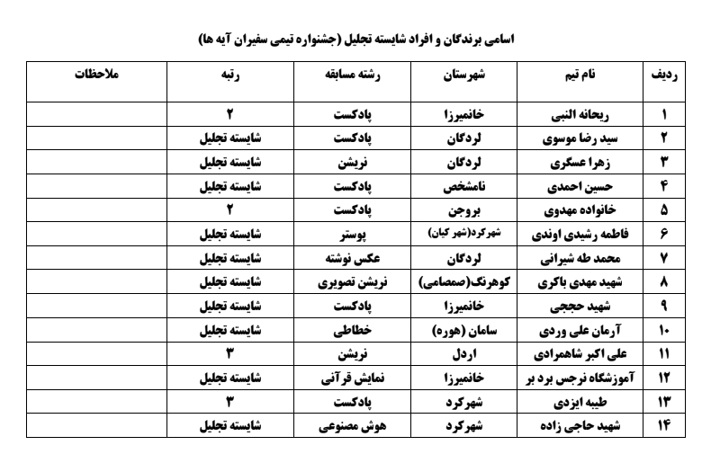 اسامی برگزیدگان جشنواره به شرح ذیل اعلام میشود: